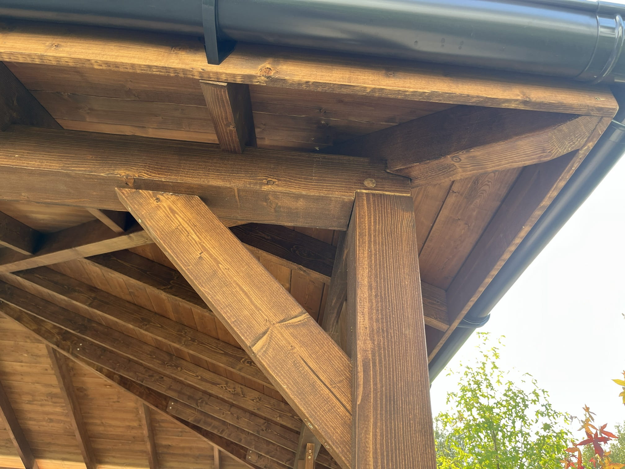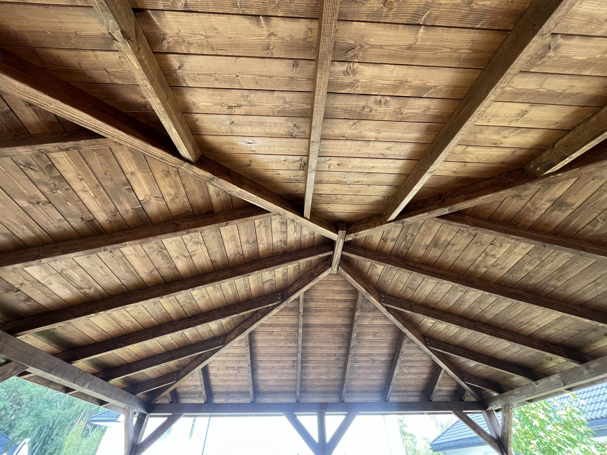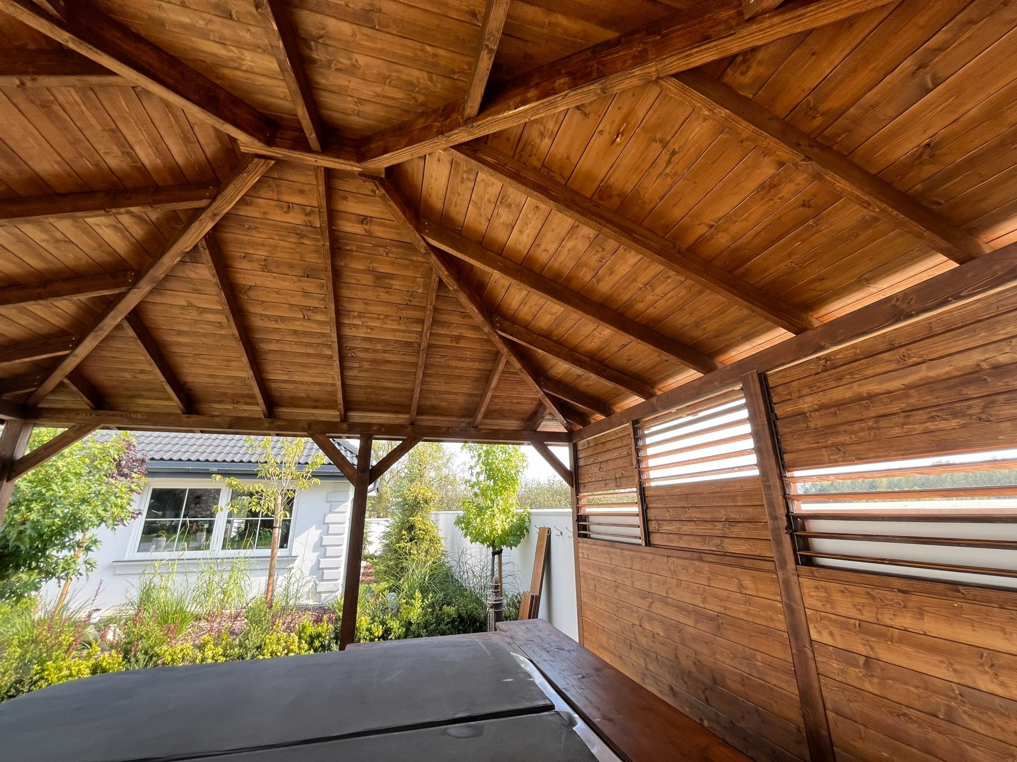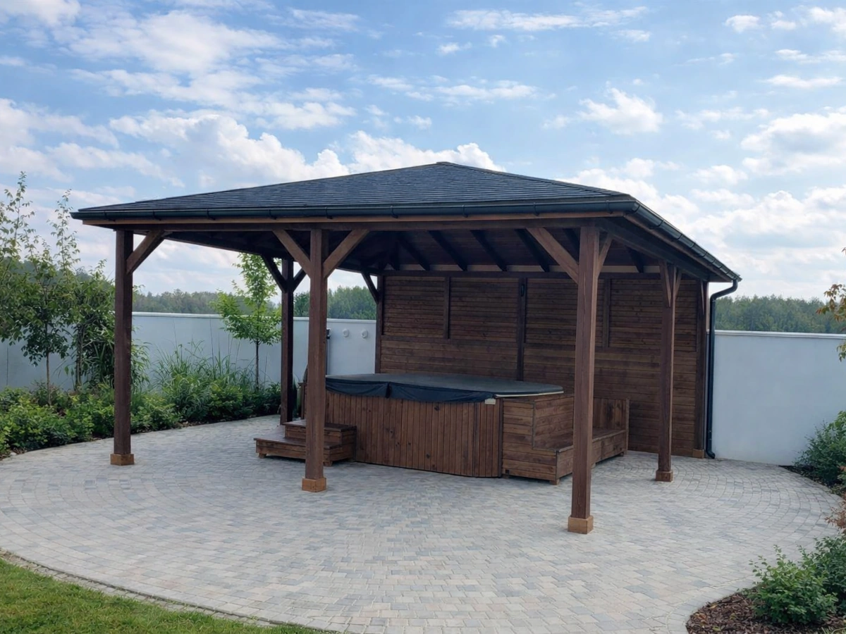 - konstrukcja wolnostojąca, dach kopertowy, ciche pokrycie dachowe;