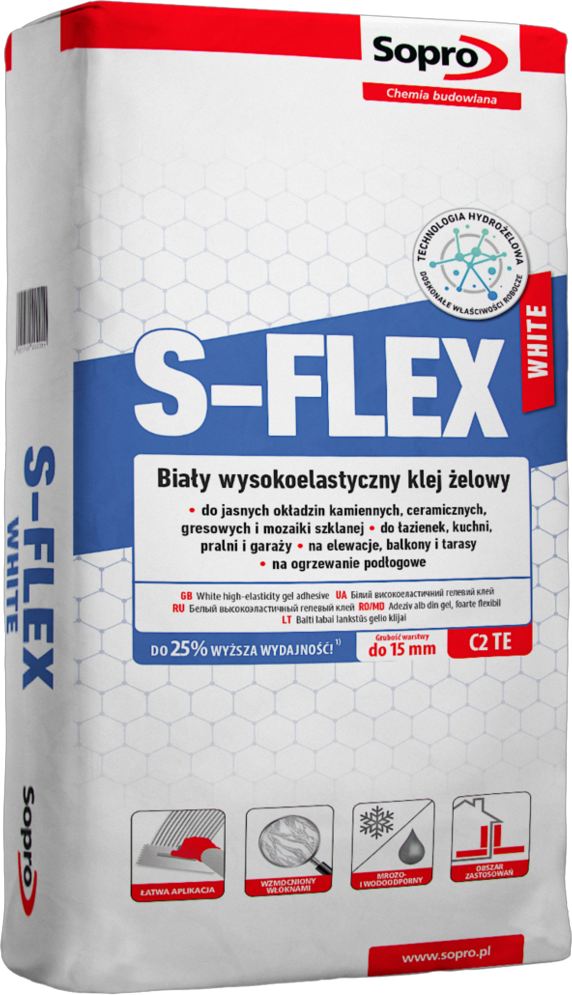 Do stosowania w pomieszczeniach mieszkalnych, usługowych, przemysłowych, obszarach wilgotnych i mokrych, salach operacyjnych, na podłogach i ścianach ogrzewanych oraz na zewnątrz, na balkonach, tarasach, schodach i elewacjach. Odpowiednio dobrane dodatki mineralne oraz hydrożel organiczny zastosowany w kleju S-FLEX white wpływają na podwyższoną retencję wody w zaprawie oraz optymalne warunki jej wiązania i twardnienia, zapewniając wysokie parametry techniczne kleju. Zastosowana nowoczesna technologia hydrożelowa wpływa również na zapewnienie bardzo dobrych parametrów roboczych. Klej ma plastyczną konsystencję, jest łatwy w aplikacji, zaprawa doskonale trzyma się pacy i łatwo się rozprowadza.