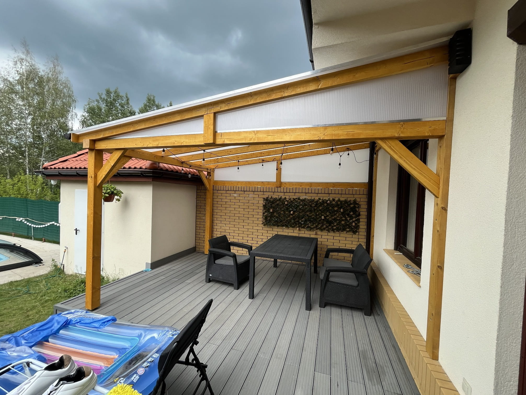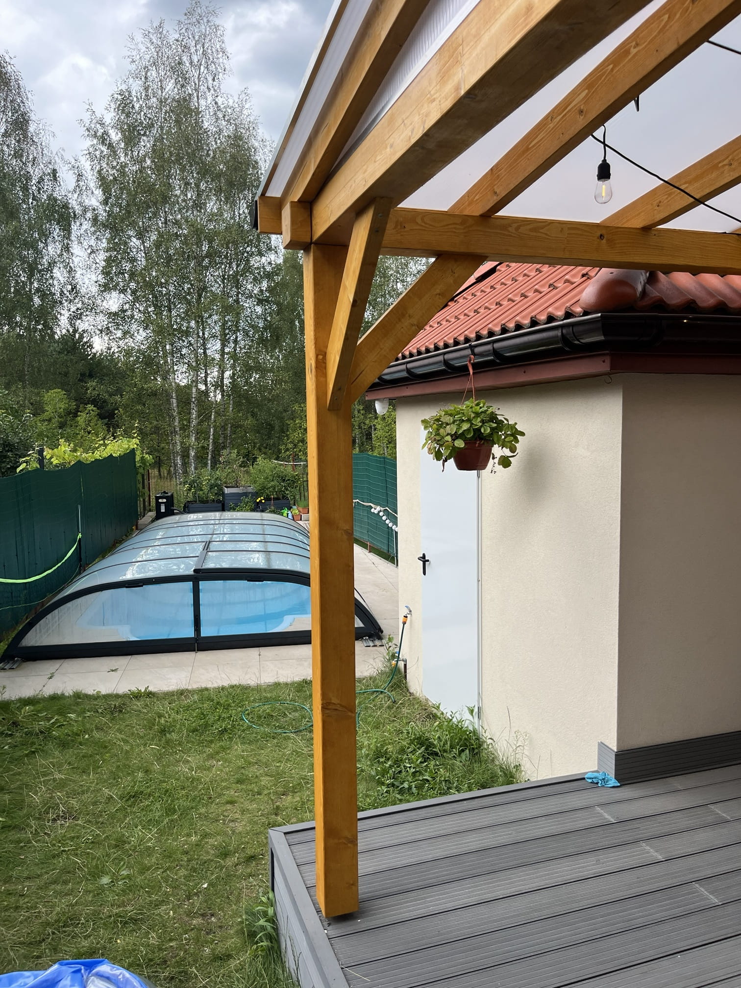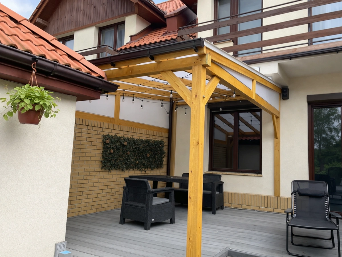 - głębokość (od przodu zadaszenia do ściany budynku): 2,95m, 3,95m lub 4,95m;